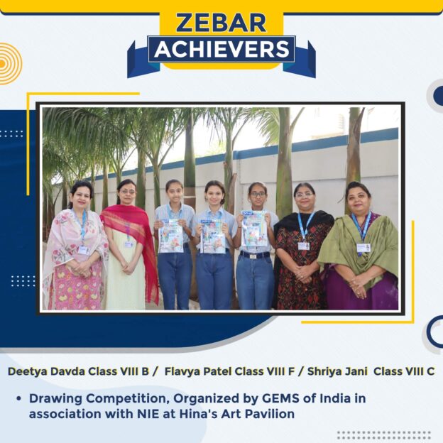 Deetya Davda (Class 8 B), Flavya Patel (Class 8 F), and Shriya Jani (Class 8 C) showcased their artistic excellence in the drawing competition organized by GEMS of India in association with NIE at Hina’s Art Pavilion.